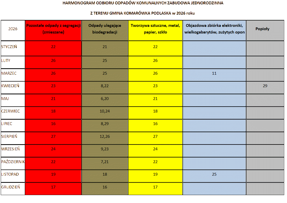 - Opłaty za odbiór odpadów komunalnych należy uiszczać w sześciu ratach bez wezwania za okresy dwumiesięczne, z dołu gotówką lub przy użyciu karty płatniczej w kasie Urzędu Gminy Komarówka Podlaska, lub przelewem na rachunek bankowy Urzędu Gminy Komarówka Podlaska nr 04 8046 1070 2003 0450 1859 0011. Wysokość opłaty wynika ze złożonej przez Państwa deklaracji.